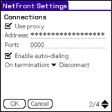 | When this box is checked, NetFront will automatically connect to the Internet without displaying a dialog message. If it is not checked, it will ask whether to connect or not with a dialog.